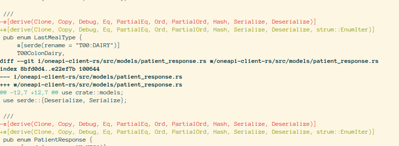 Now edit the templates inside out directory. I had to add strum to Cargo.mutache and strum::EnumIter inside derive of all pub enum inside model.mustache file.