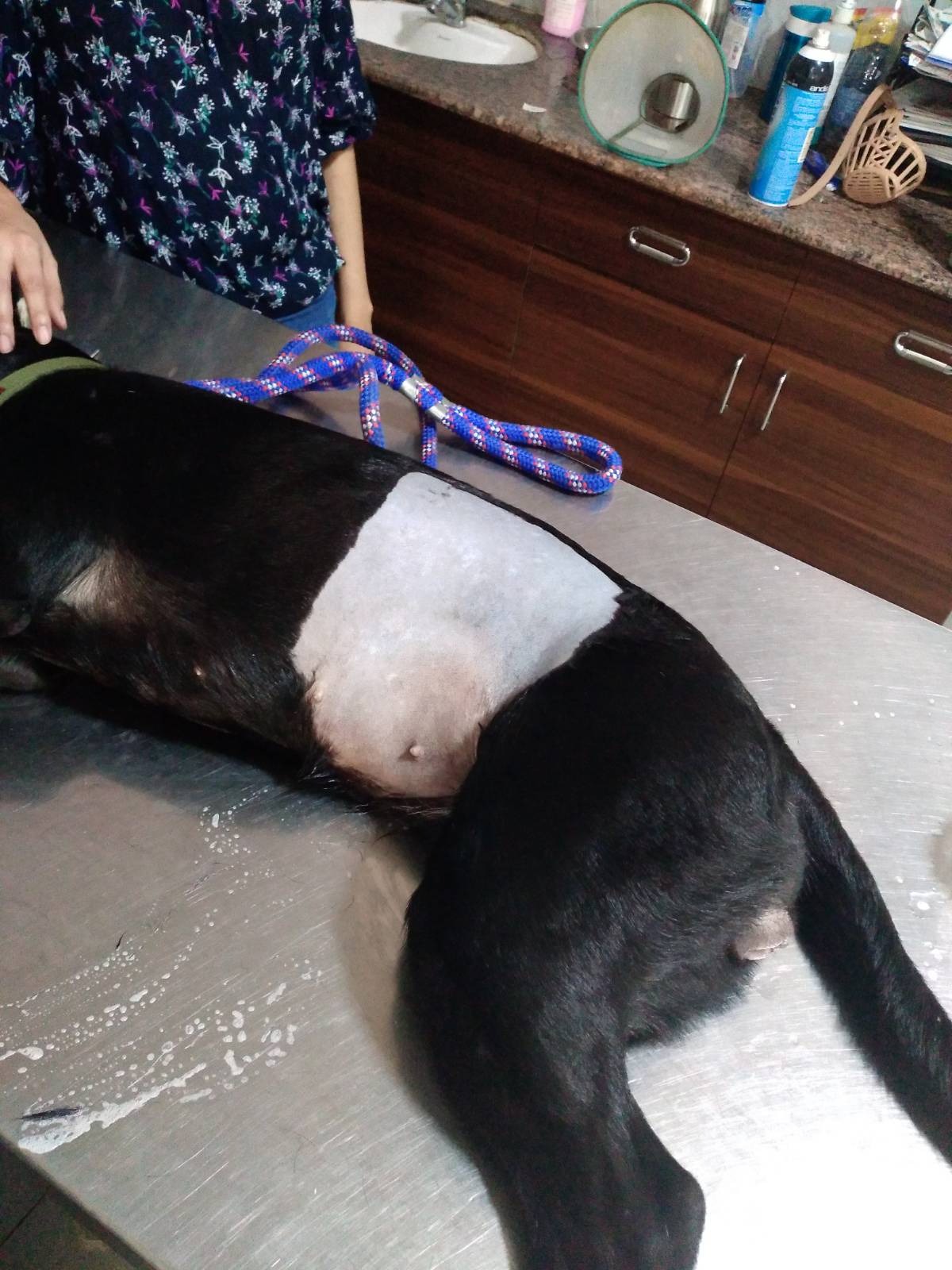 Before we walked into the hospital at 1 pm, I already put the muzzle on her. This time she let me put on the muzzle without much protest. Phew! The nurse gave her a sedative and we removed the muzzle ten minutes after the sedative was given. Most dogs would vomit after sedatives. She did too. The nurse shaved her a little around her tummy before the surgery.