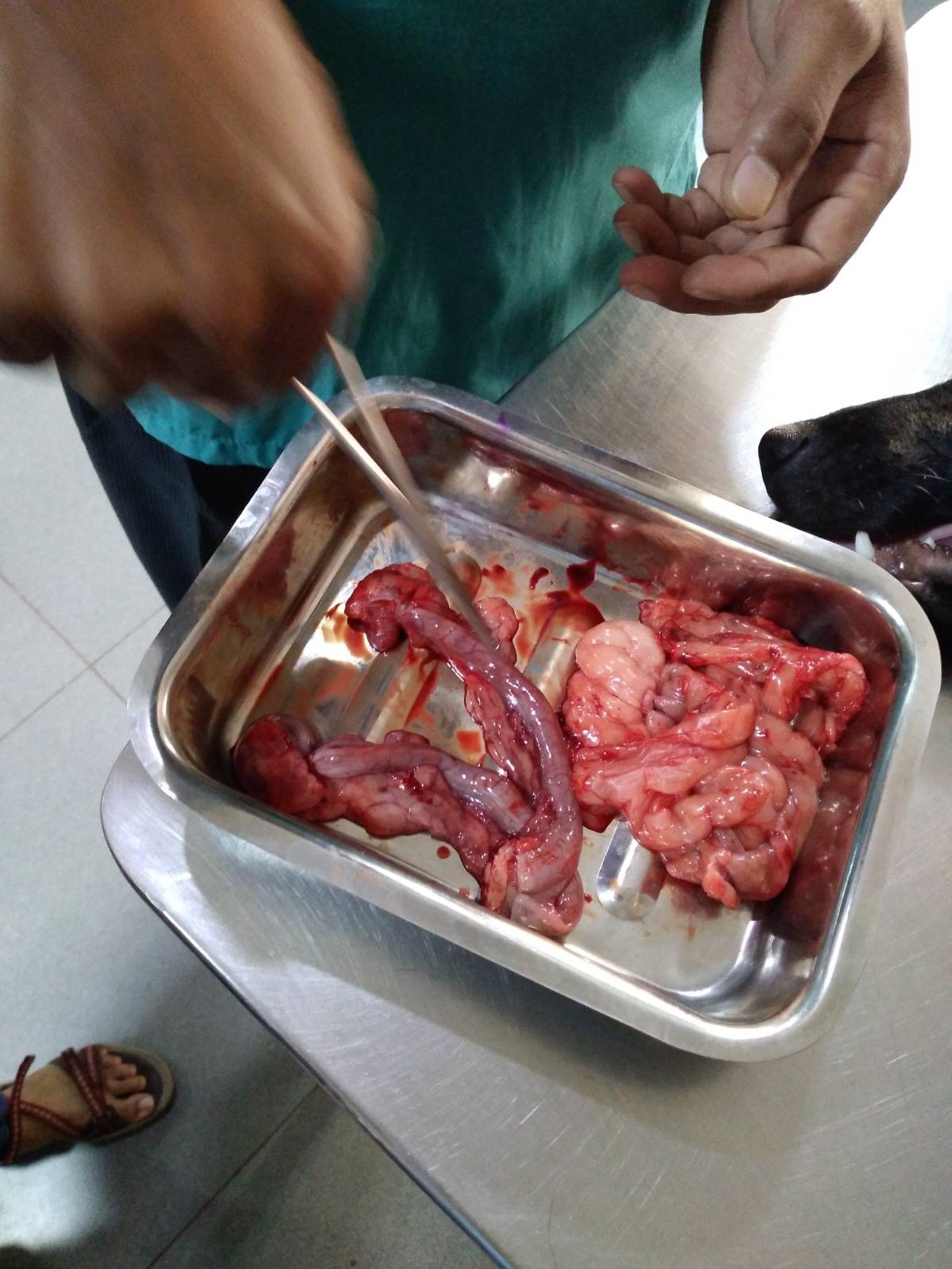 The removed organs: ovary and uterus. There are two of them in this container. The other one is from a larger dog.